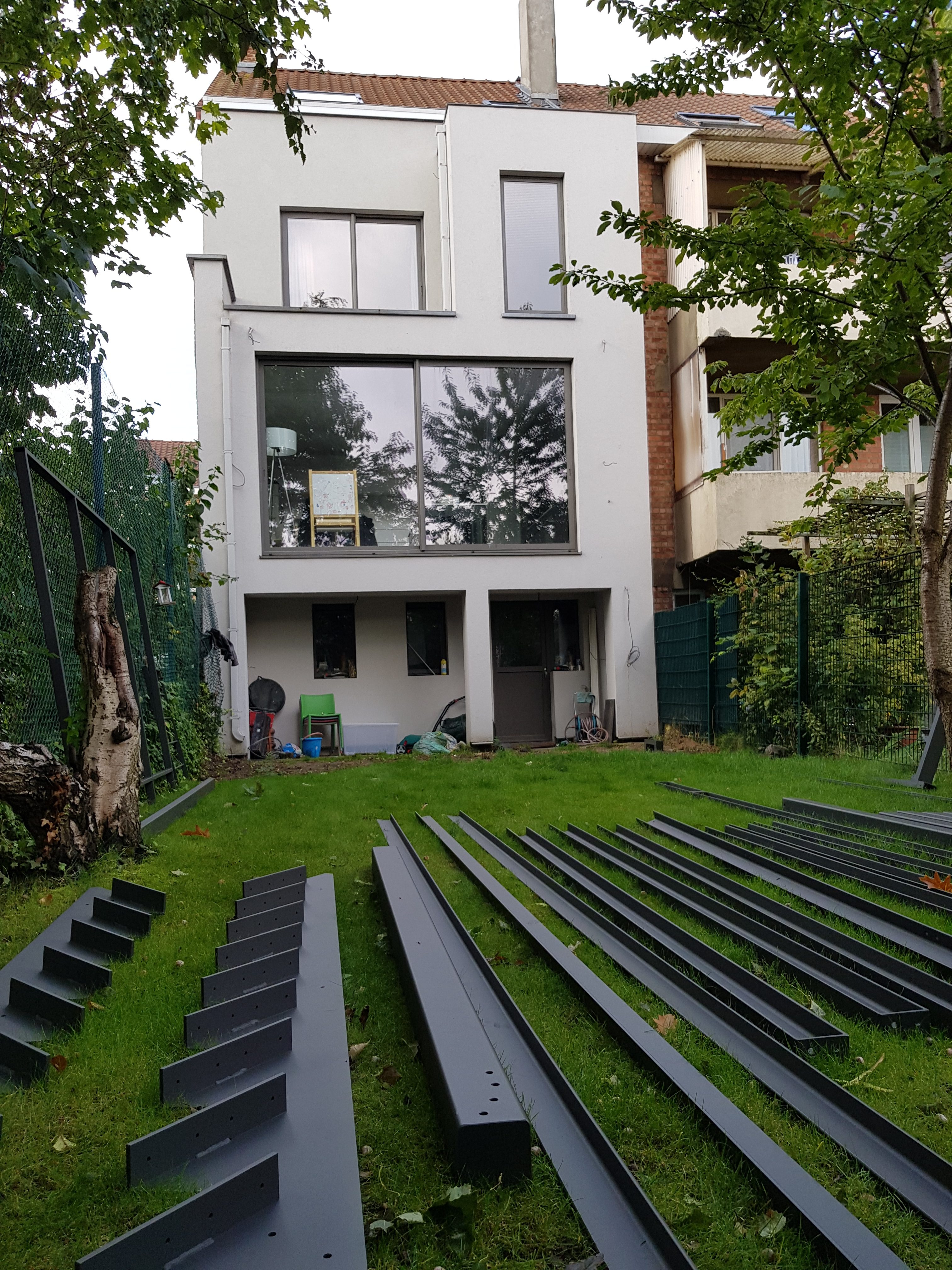 Extension terrasse sur pilotis, lattis en bois massif, structure en acier thermolaqué avec sous-toiture