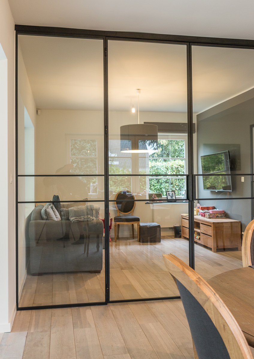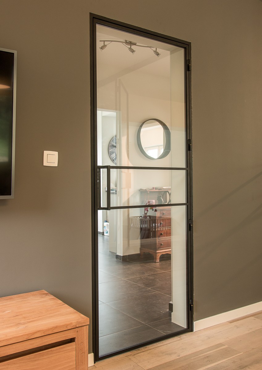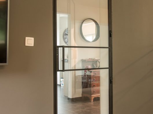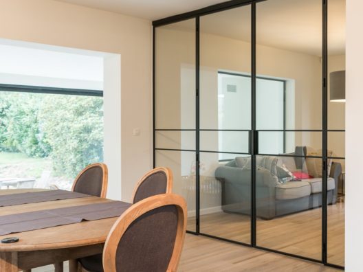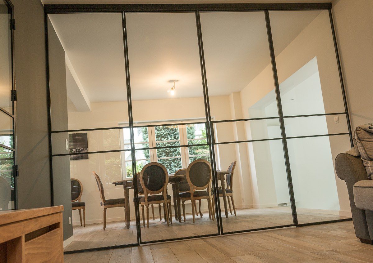 Cloison vitrée à cadre acier contenant un double ouvrant et deux partie fixes