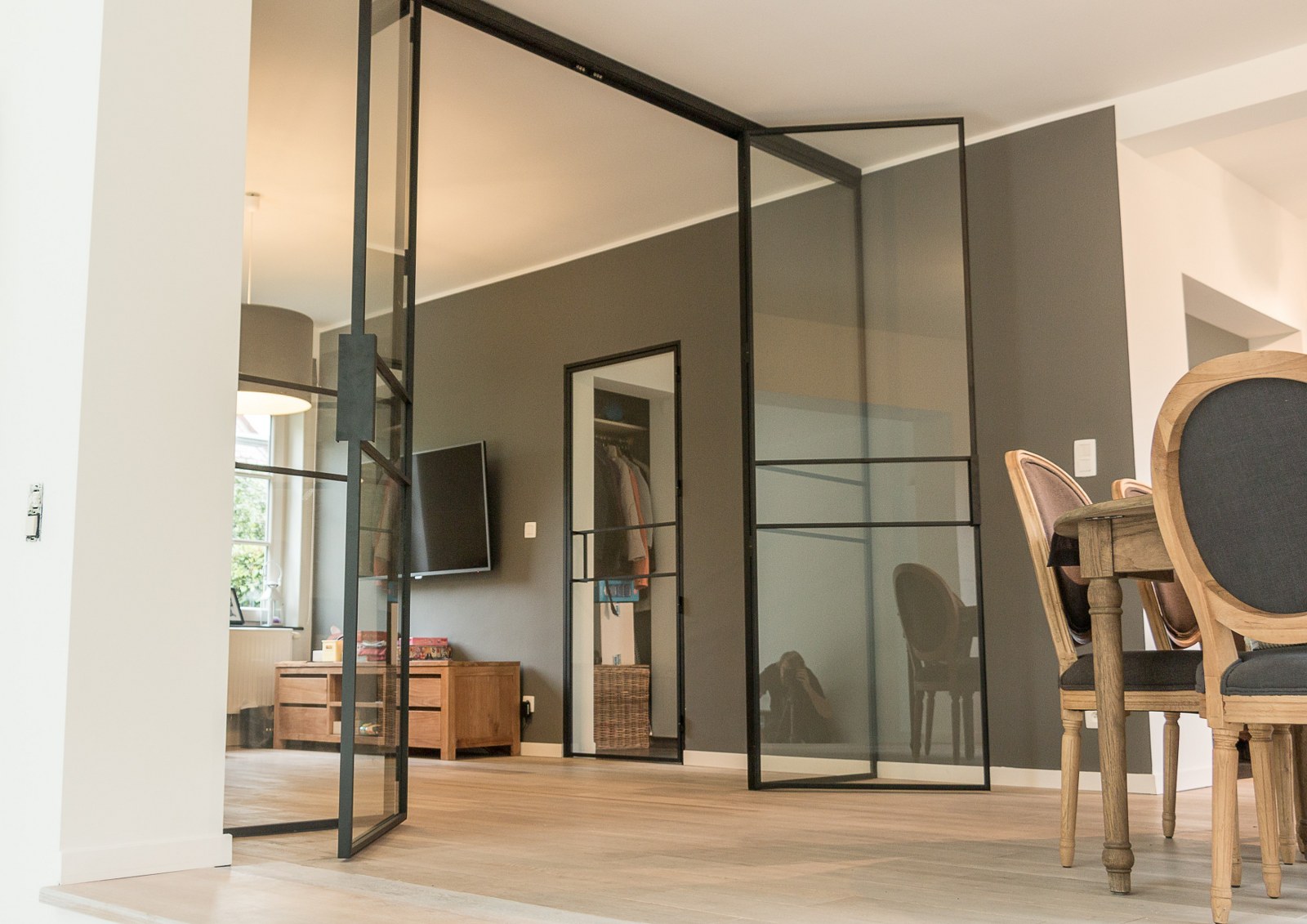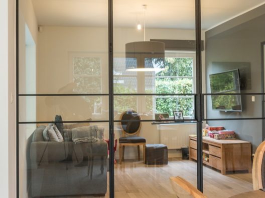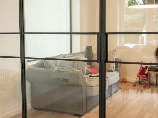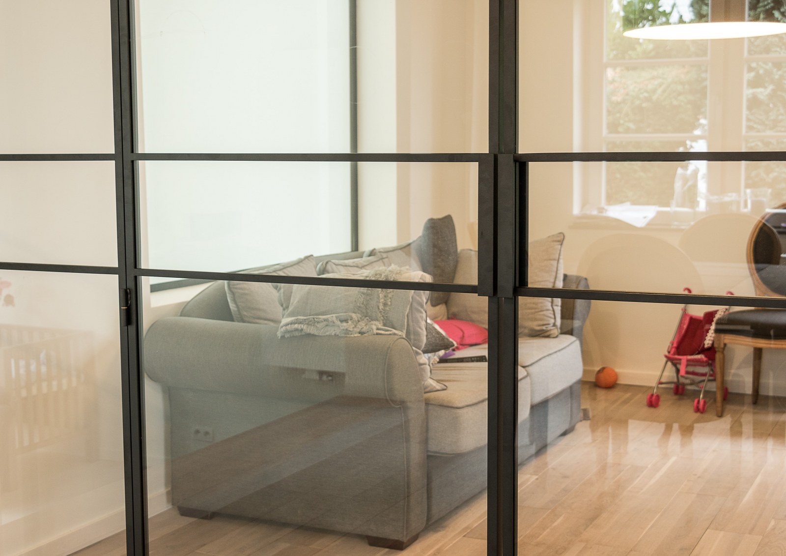 Cloison vitrée à cadre acier contenant un double ouvrant et deux partie fixes