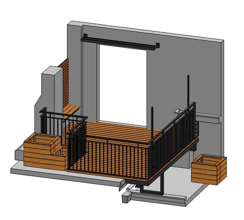 Aménagement sur mesure d’une terrasse urbaine. Plancher, garde-corps, bacs à fleurs, support pour glycine, etc.