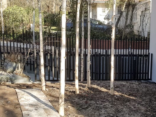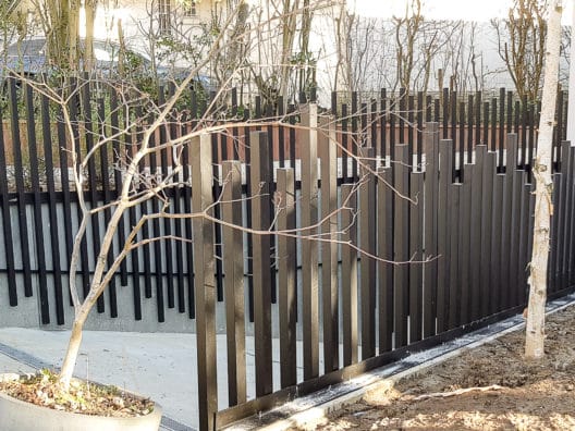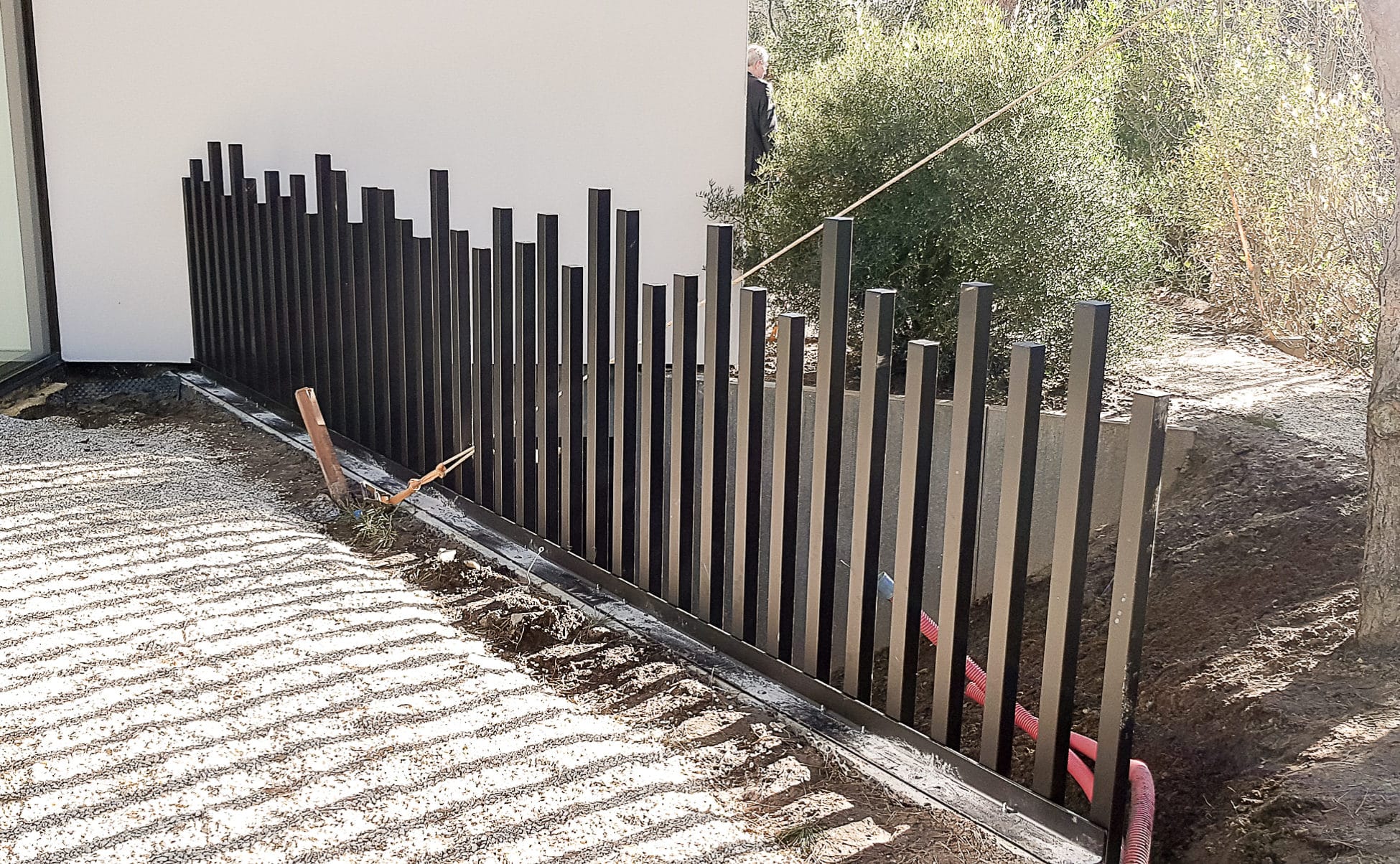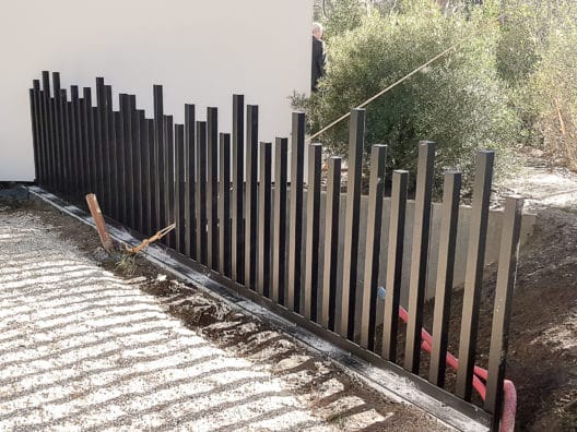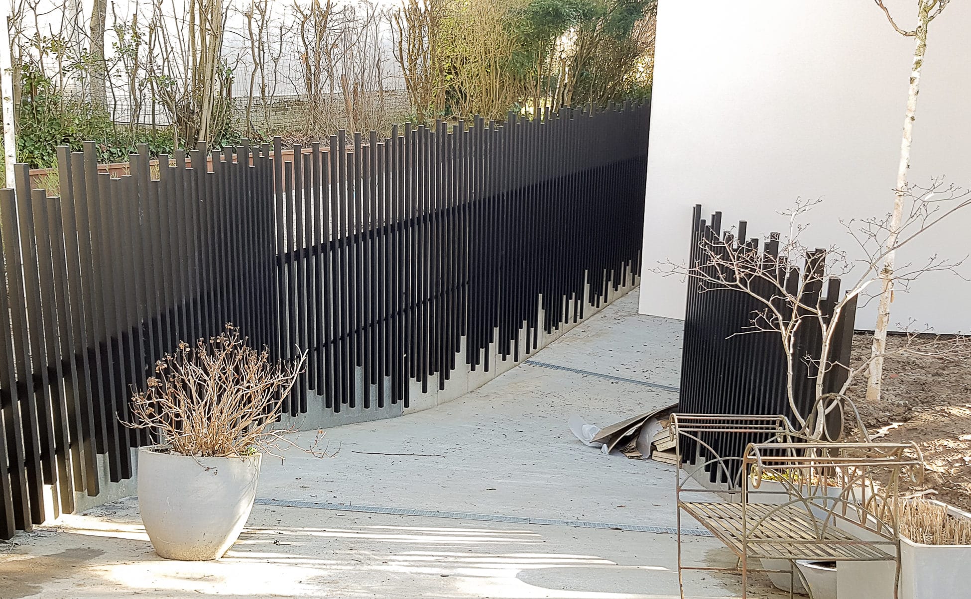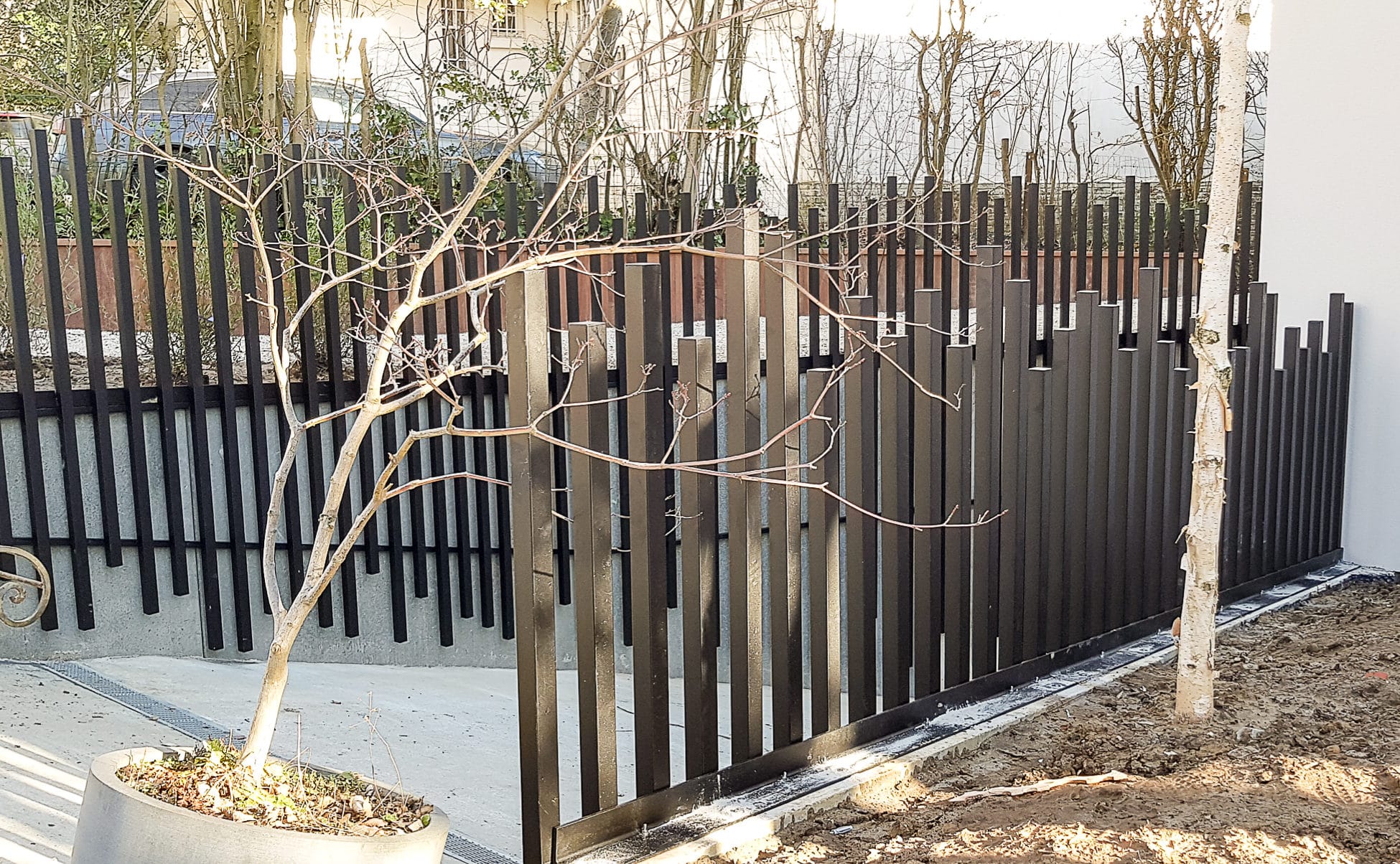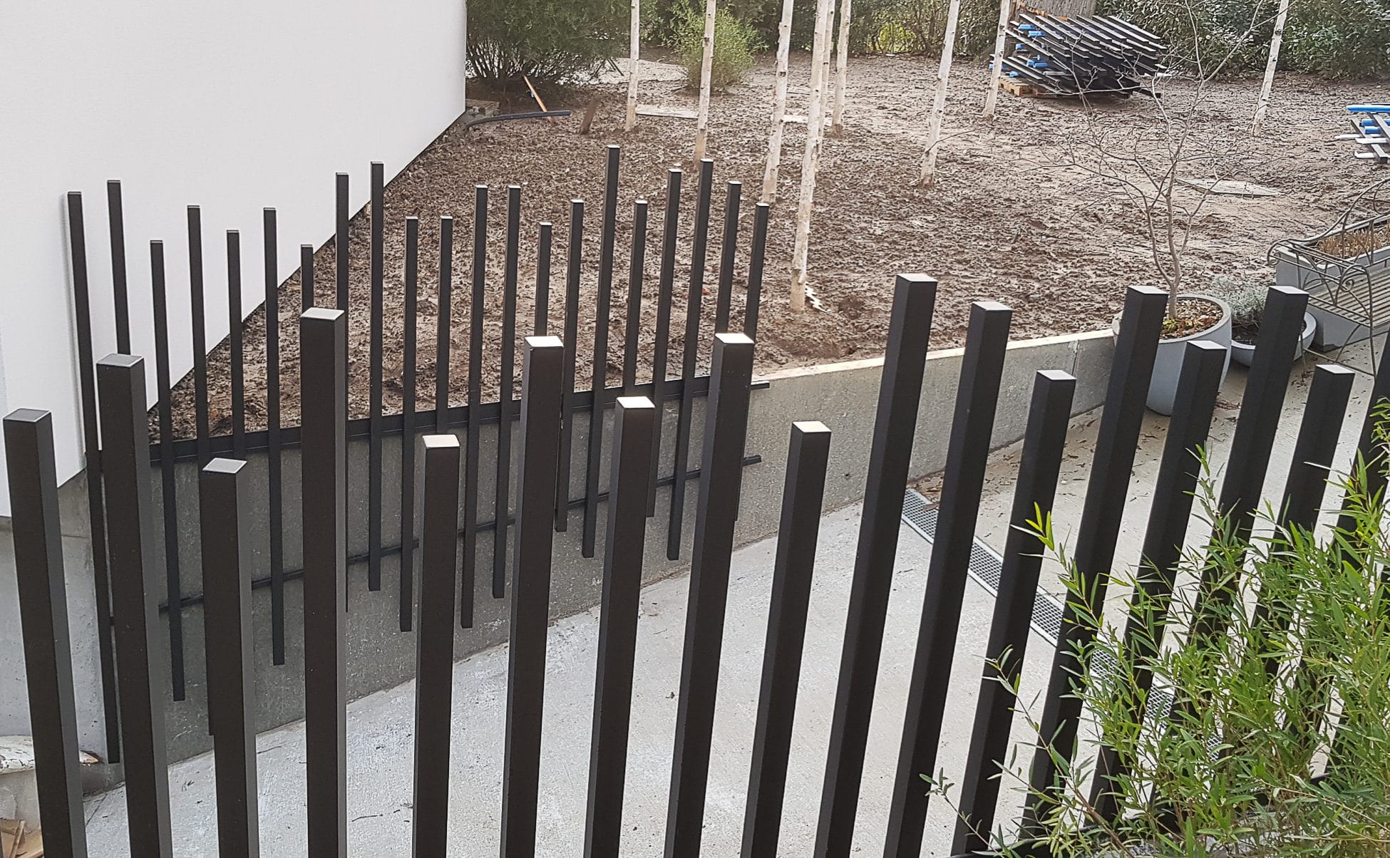 Garde corps avec montant disposés de manière séquentielle et servant de cache mur béton
